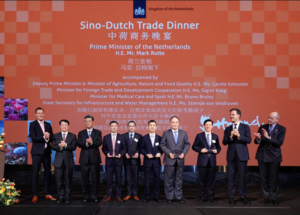 Isbrand Ho, MD at BYD Europe (fourth from the right), receives the "Invest in Holland" Certificate at the Trade Dinner in Guangzhou, witnessed by the Prime Minister of the Netherlands, Mark Rutte (second from the right)