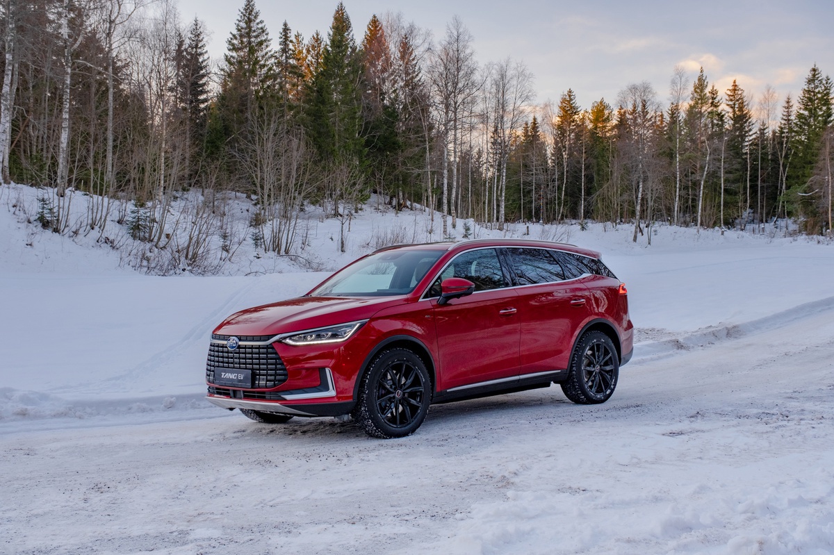 The pure-electric all-wheel-drive BYD Tang SUV driving in Norway