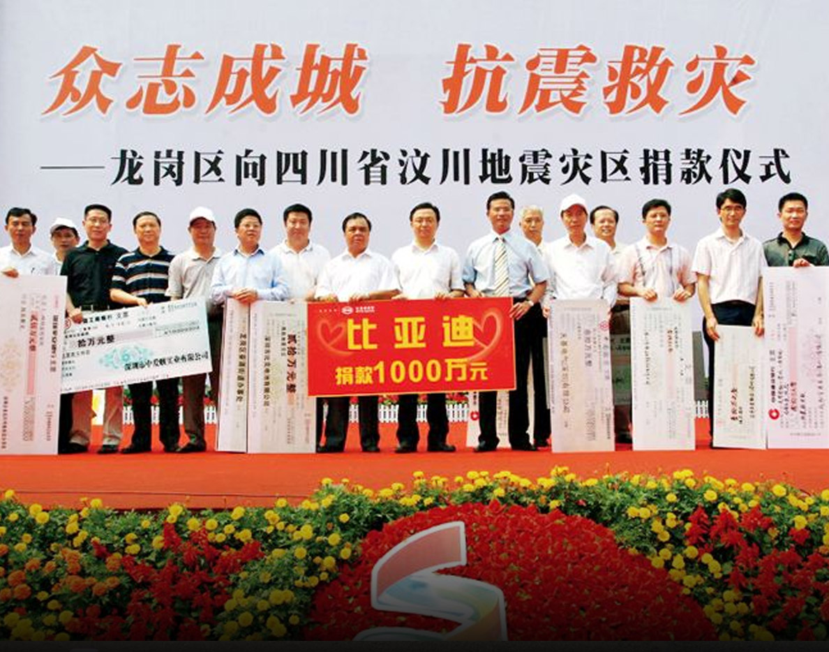 BYD also pays close attention to the situation and peoples living conditions after a destructive earthquake in 2008. BYD's initial step was to donate over 12 million euros and immediately dismount 1000 hoisting jacks from new cars -which were quickly delivered by air through the army- to be used to save as many lives as possible at the rescue sites.